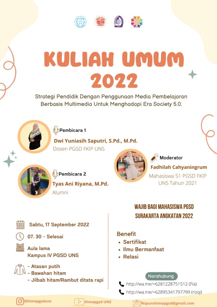 Pada Sabtu, 17 September 2022, sebuah kuliah umum bertajuk “Strategi Pendidik dengan Penggunaan Media Pembelajaran Berbasis Multimedia untuk Menghadapi Era Society 5.0” sukses diselenggarakan dan mendapat respons antusias dari para mahasiswa. Kegiatan ini menghadirkan dua narasumber inspiratif, yakni dosen sekaligus praktisi pendidikan Ibu Dwi Yuniasih Saputri, S.Pd., M.Pd., serta alumni berprestasi Tyas Ani Riyana, M.Pd.